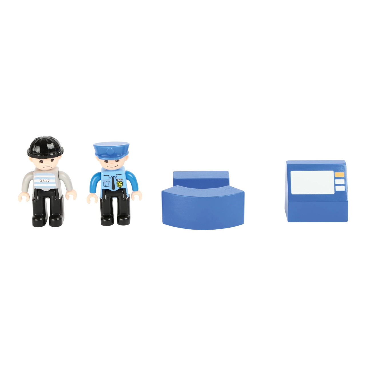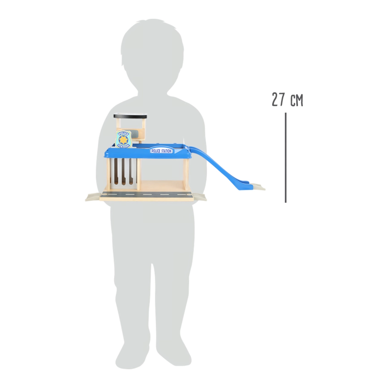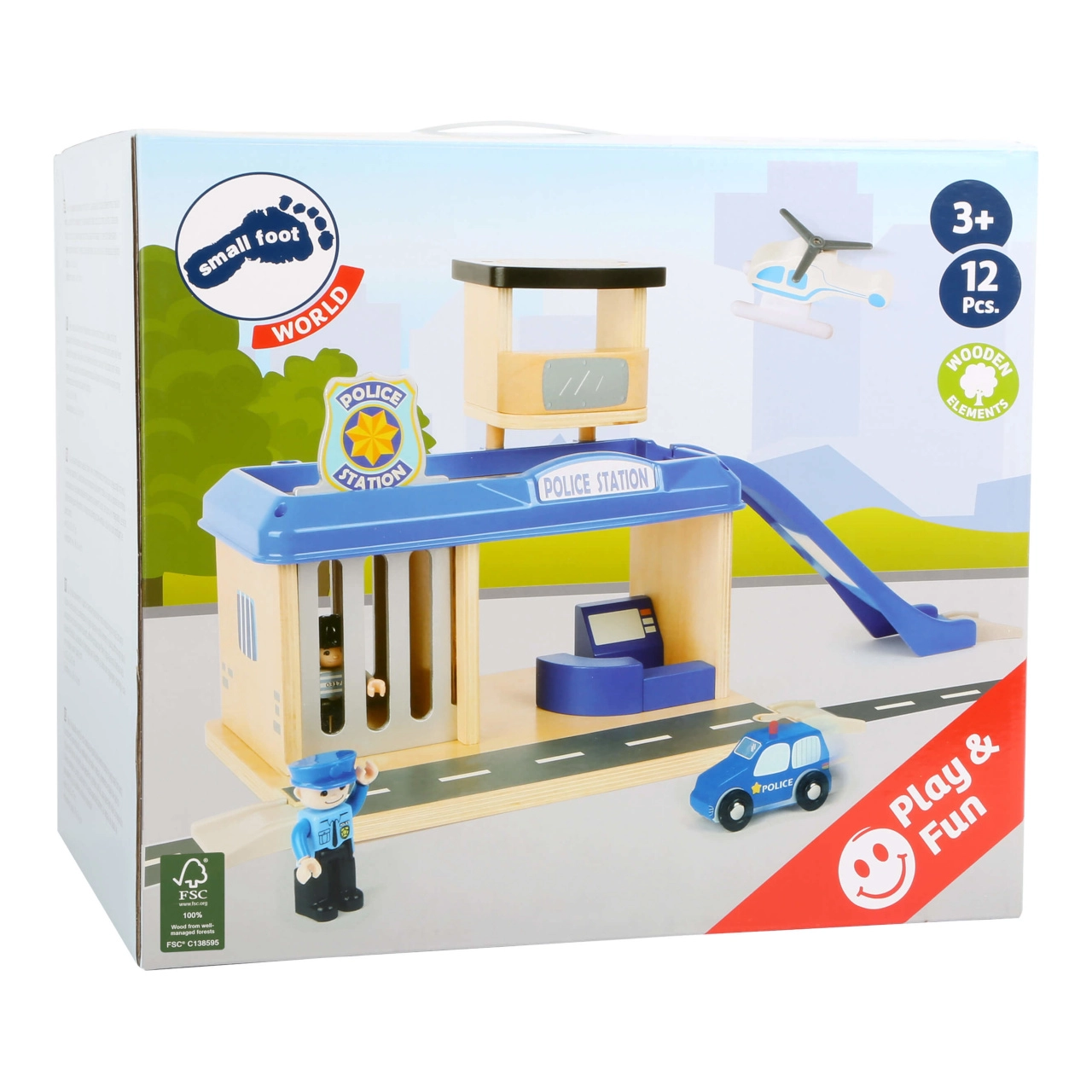 Realistiška small foot policijos stotis skatina vaikų vaizduotę ir smulkiosios motorikos raidą. Du aukštai, bokštas su sraigtasparnių aikštele, veikianti kamera su ištraukiamomis grotomis ir parkavimo rampa sukuria apgalvotą žaidimų aplinką. Rinkinyje yra policijos automobilis, sraigtasparnis ir dvi judančios figūrėlės – policininkas ir nusikaltėlis – begaliniams žaidimų scenarijams.