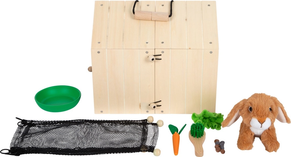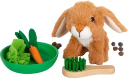 Rinkinyje yra pliušinis triušis ir praktiški priedai: šluotelė, dubenėlis, medinė morka, salotos lapas ir veltinio „spirgai“ autentiškiems priežiūros scenarijams. Tai puiki alternatyva vaikams, kurie kol kas negali turėti tikro augintinio, padedanti ugdyti socialinius ir emocinius įgūdžius.