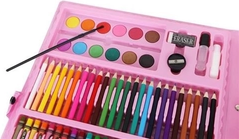- lagaminėlis, 24 spalvoti pieštukai, 24 flomasteriai, 48 vaškinės kreidelės, 48 aliejiniai pasteliai, 12 akvarelinių dažų, teptukas, paletė, 1 pieštukas, drožtukas, trintukas, klijai, korektorius, 5 lapai popieriaus