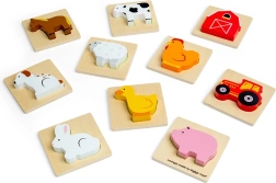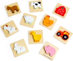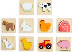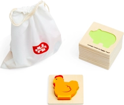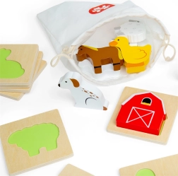 Šis kelioninis ūkio temos žaidimas suteikia vaikams atradimo džiaugsmo. Jie įkiša ranką į medžiaginį maišelį ir pagal lietimą randa detalę, kuri tinka į atitinkamą medinę pagrindo lentelę. Pramoga, kuri nepastebimai ugdo susikaupimą, akių–rankų koordinaciją ir žodyną, įvardijant ūkio gyvūnus bei daiktus.