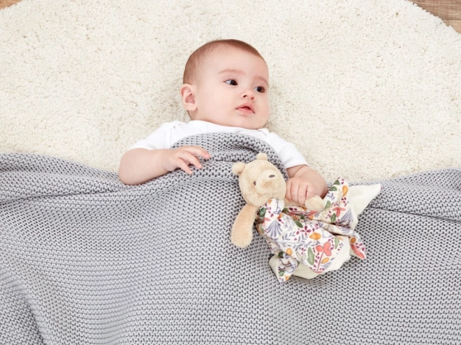 Minkštas pliušas ir glotnus audinys su spalvotu raštu kuria saugumo jausmą ir padeda mažyliui greičiau nusiraminti bei užmigti – idealiai tinka lovytei ir vežimėliui.