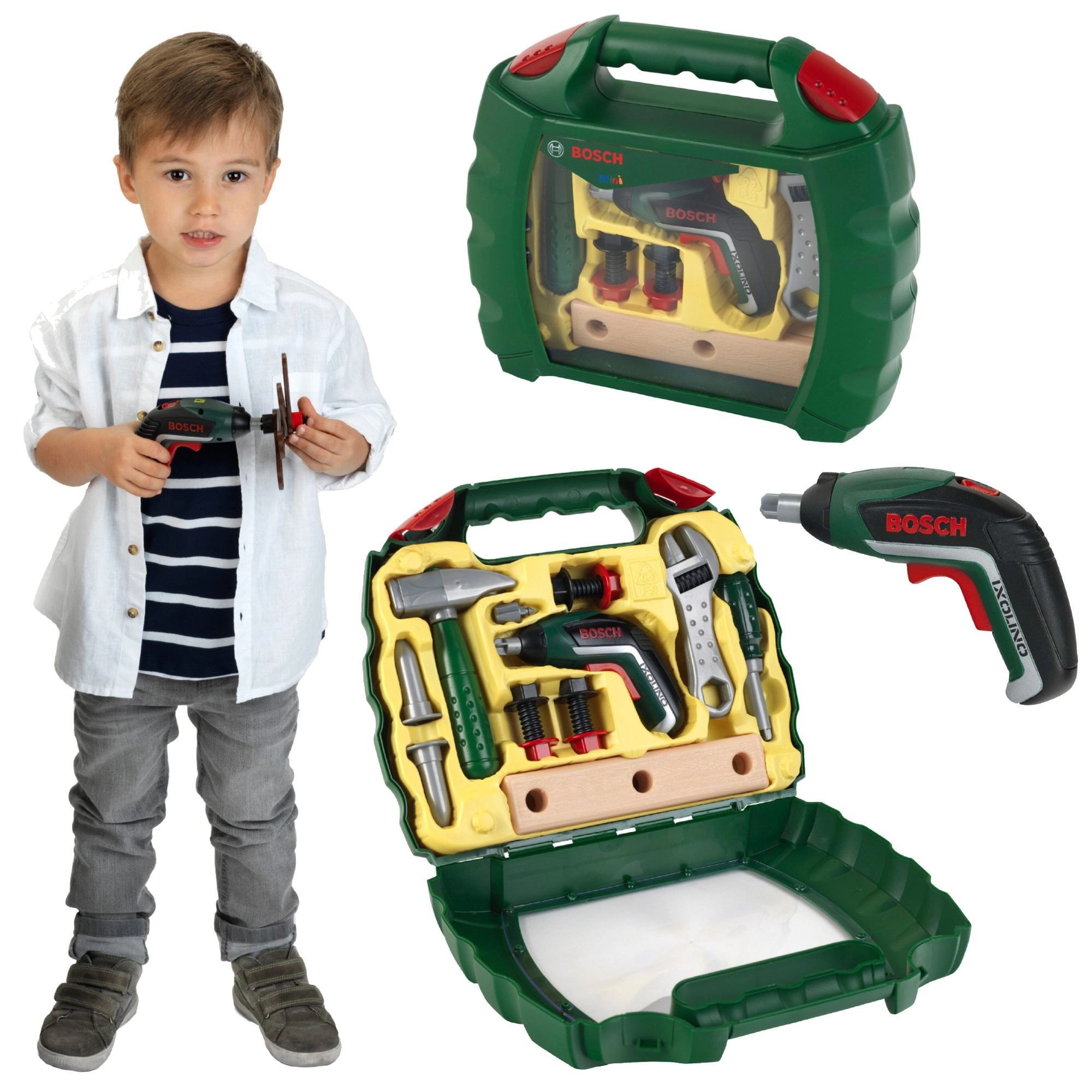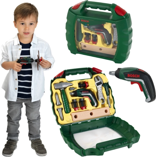 Stilingas vaikiškas įrankių lagaminėlis iš licencijuotos BOSCH Mini serijos, gamintojo Klein, suteikia realistišką mažųjų meistrų žaidimą. Rinkinyje yra baterijomis veikantis akumuliatorinis suktuvas Ixolino II su sukimu į dešinę ir kairę bei variklio garsu, taip pat atsuktuvas, prancūziškas raktas, plaktukas, varžtai su veržlėmis ir „medinės“ lentelės varžtų sukimui ir kalimui treniruoti. Tvirtas tamsiai žalias lagaminėlis su permatomu dangčiu ir dviem raudonais užraktais viską saugiai laiko vienoje vietoje.