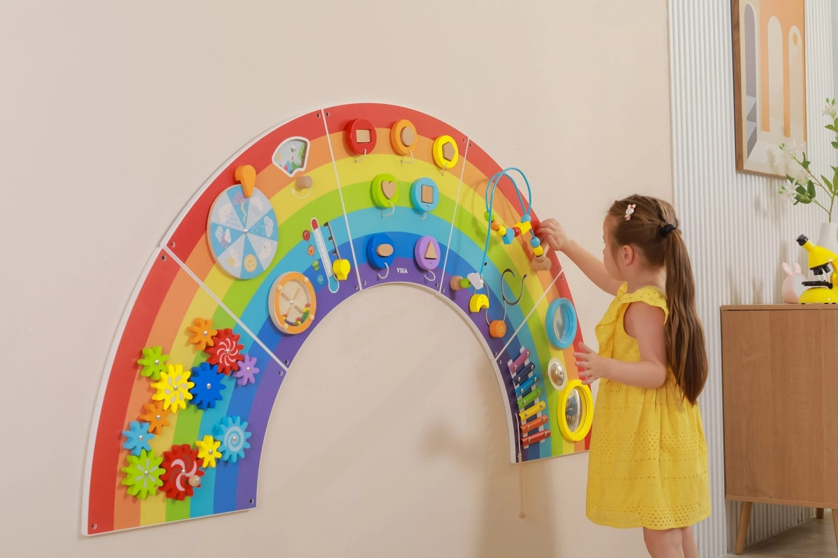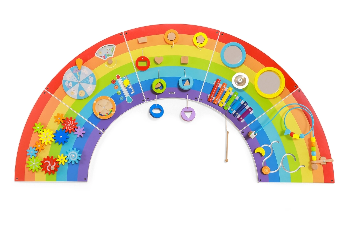 Medinė sieninė lenta vaivorykštės formos iš VIGA yra daugiafunkcis edukacinis žaislas su 12 veiklų jutiminiam tyrinėjimui ir smulkiajai motorikai. Ji siūlo krumpliaračius, orų skydelį, sukamą diską, formų rūšiuoklę, ksilofoną, išgaubtą ir įgaubtą veidrodį, gongą ir vėrimo elementą su karoliukais. Ji padalinta į 5 vienodas dalis patogiam transportavimui ir montavimui, pagaminta iš medžio su FSC sertifikatu ir nudažyta netoksiškais dažais.