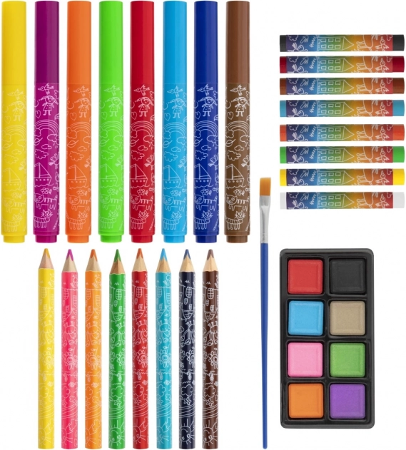 33 dalių rinkinys siūlo platų spalvų ir priemonių pasirinkimą piešimui, braižymui ir spalvinimui – idealu pradedantiesiems kūrėjams.