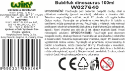 Linksmas burbulų pūstuvas dinozauro formos pradžiugins ir mažuosius, ir suaugusiuosius. Dėl 100 ml tūrio ir 35 cm ilgio sukursite daugybę gražių burbulų. Galimos 4 spalvinės versijos – mėlyna, geltona, žalia ir rožinė.