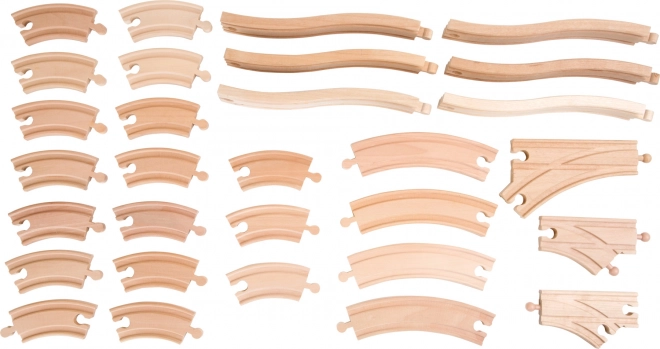 Su šia nuostabia medine geležinkelio trasa ir 140 dalių vaikai patirs valandas linksmybių. Rinkinyje yra tvirtos medinės bėgių atkarpos, spalvingi lokomotyvai ir vagonai, tiltai ir daugybė kitų priedų kūrybingoms geležinkelio scenoms kurti.