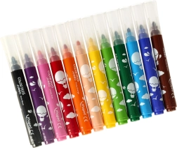 Saugūs ir smagūs flomasteriai patiems mažiausiems nuo 1 metų: užblokuotas 5 mm antgalis, atsparus spaudimui, išplaunamas rašalas nuo odos ir audinių bei 12 sodrių spalvų su ventiliuojamu dangteliu ramiai kūrybai.